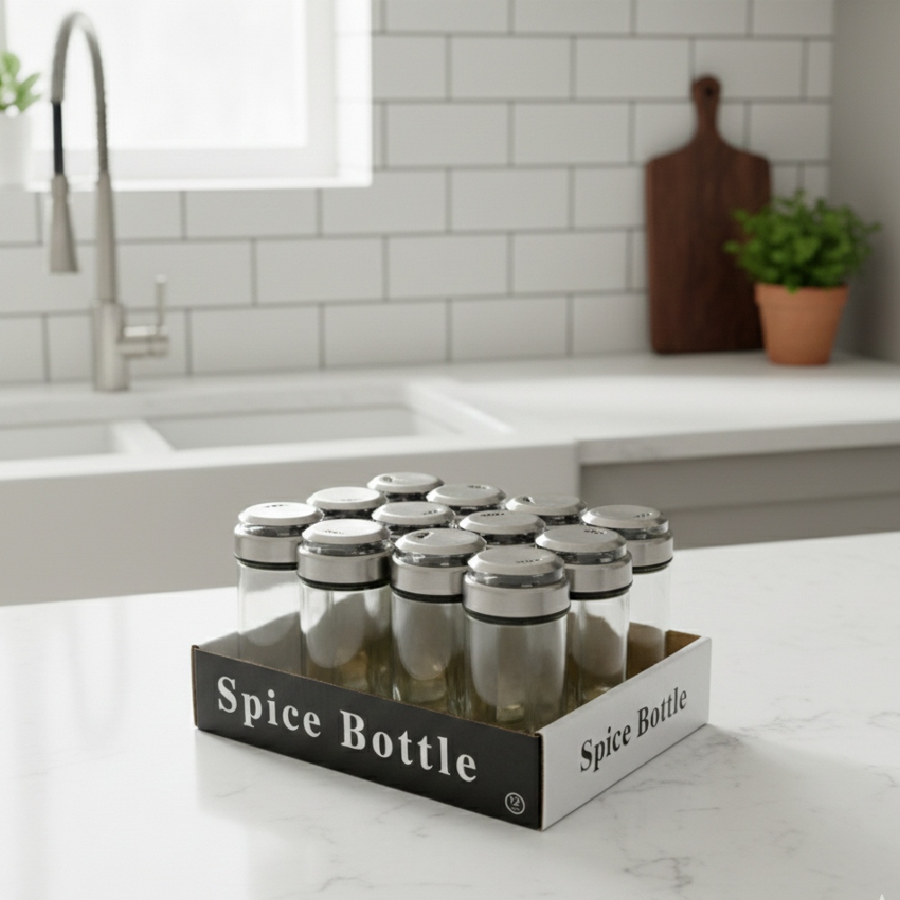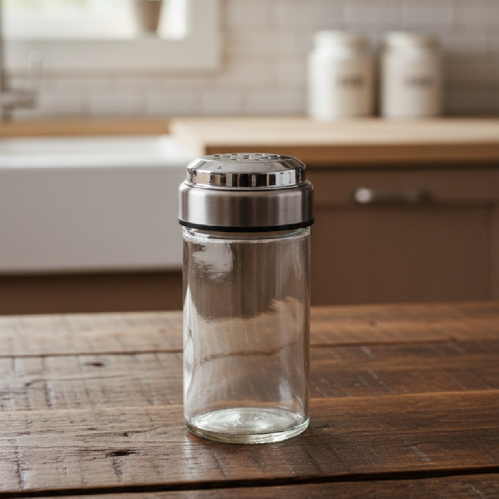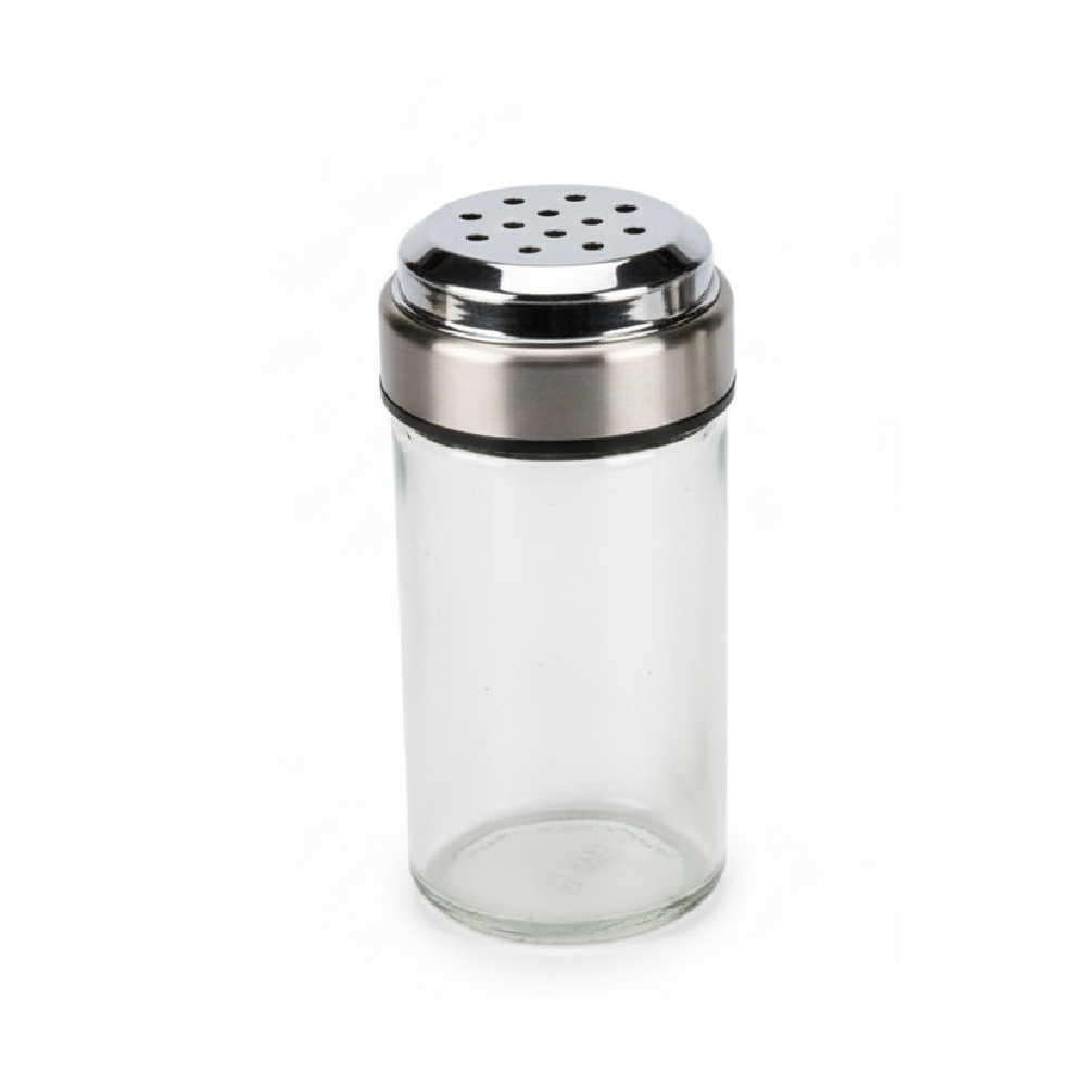 - Funcionalidad: La tapa metálica está perforada con múltiples orificios de un tamaño uniforme, diseñados para dispensar especias o condimentos secos y molidos finamente, como sal de mesa, pimienta o azúcar en polvo.