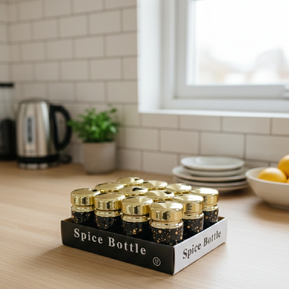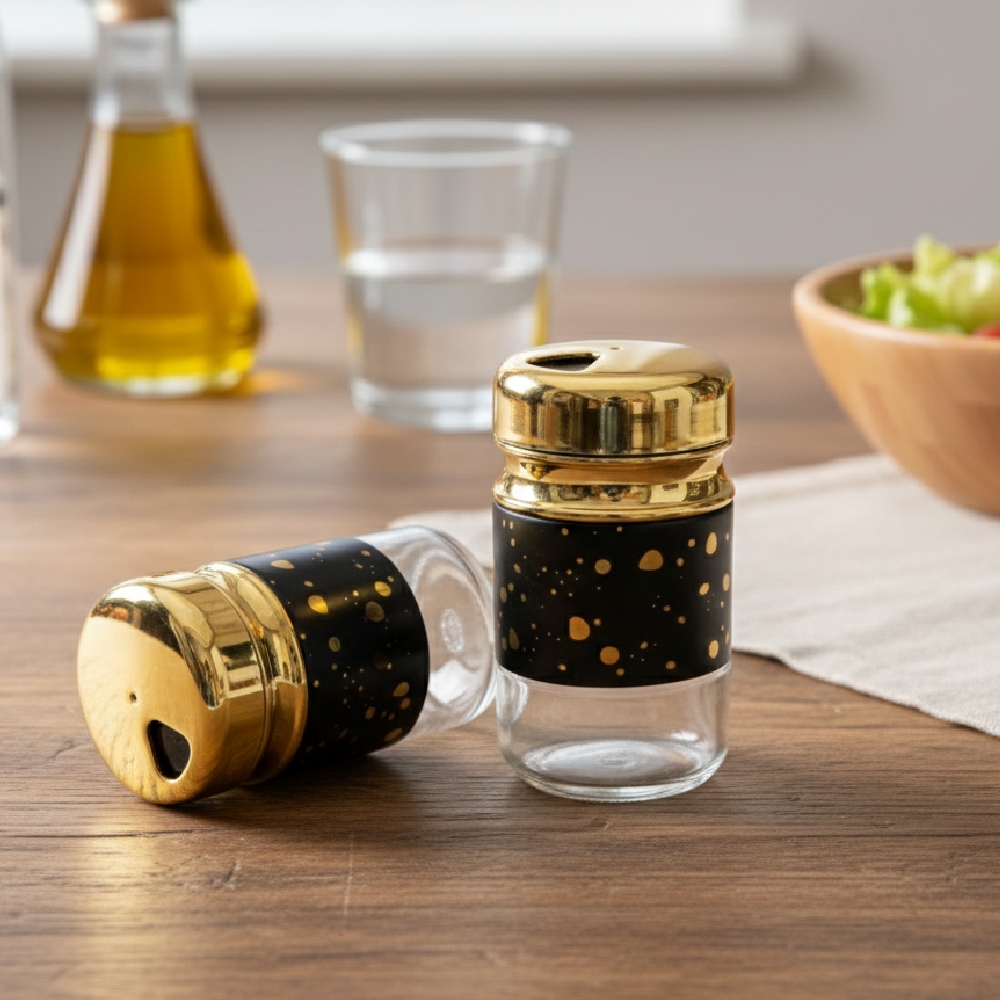- Diseño: Combina un cuerpo de vidrio transparente con una tapa y una banda decorativa de color dorado brillante. La banda negra presenta un patrón de puntos o salpicaduras doradas.